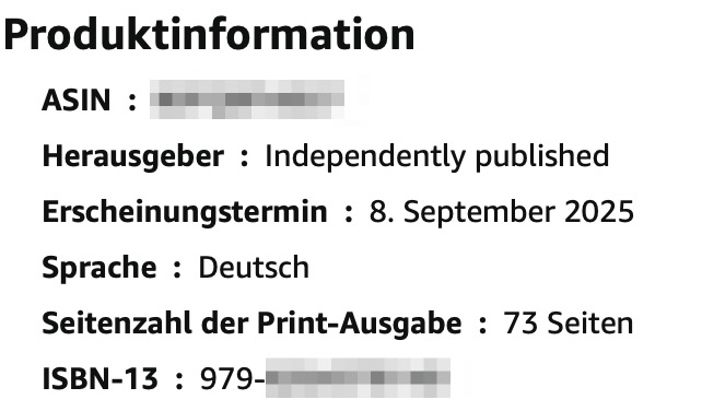Es gibt einige wichtige Anhaltspunkte, ob es sich um ein KI-Slop-Buch handelt. Der erste ist, neben dem Cover, natürlich die Frage, welcher Verlag dahinter steht. Kindle Direct Publishing-Titel sind nämlich immer ohne Verlagsangabe. Das seht Ihr direkt auf der Produktseite, wenn Ihr auf "Alle Details anzeigen" klickt: Hier steht normalerweise ein Herausgeber, und der ist (zumindest bei Qualitätslektüre) in der Regel ein namhafter Verlag.