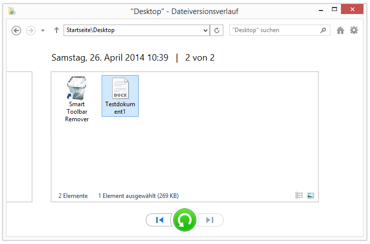Navigiert jetzt in der Oberfläche der Wiederherstellung in den Ordner, in dem die verlorene oder versehentlich gelöschte Datei gelegen hat und wählt diese aus. Klickt anschließend auf den grünen Wiederherstellungsknopf: Die Datei wird wieder aus dem Backup zurückgeholt.