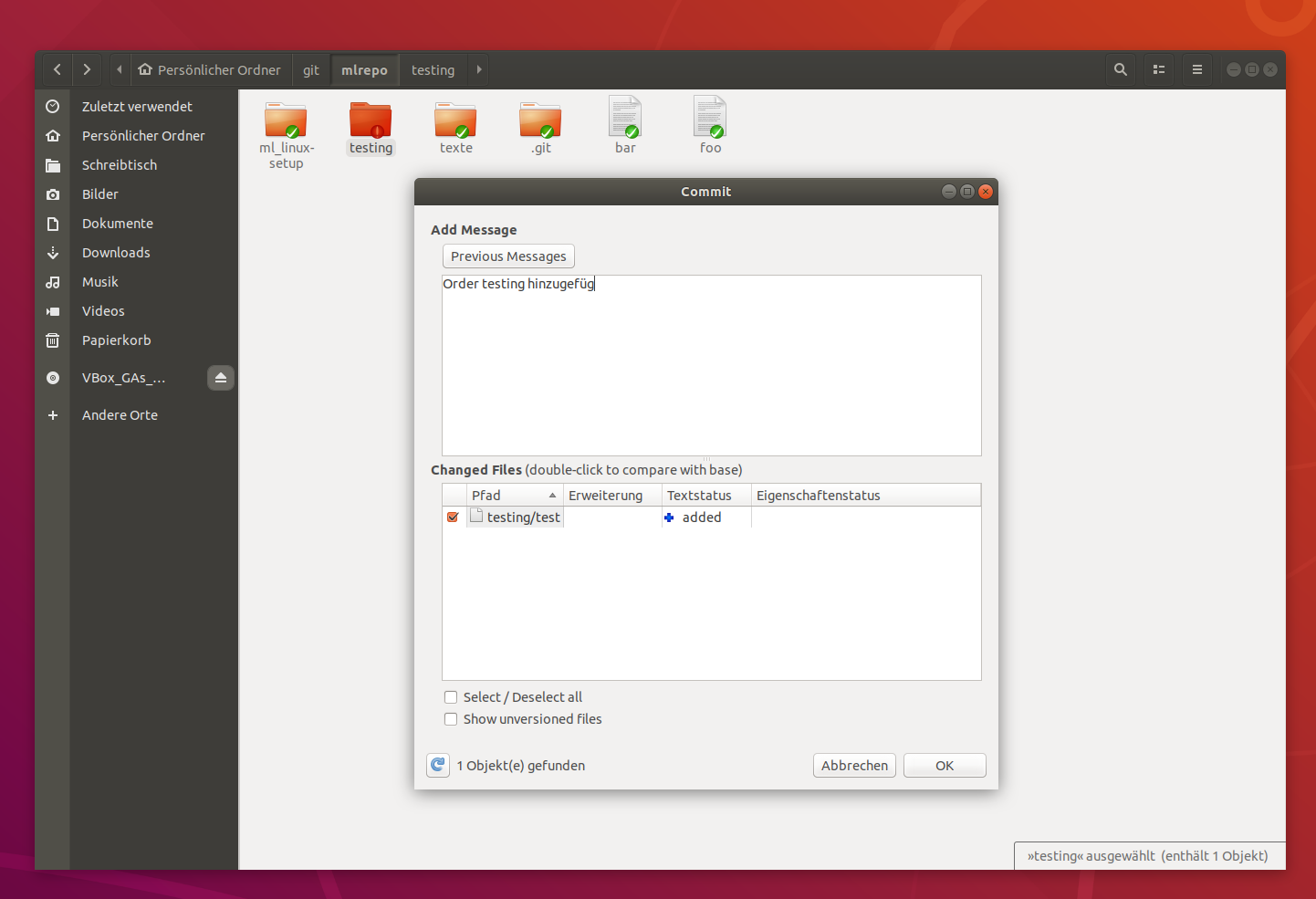Für alle Tools öffnet sich jeweils ein eigenes Fenster, hier zum Beispiel für den commit-Befehl. Achtet im Hintergrund mal auf die Icons der Dateien: RabbitVCS zeigt den git-Status über kleine Symbole, was die Arbeit enorm erleichtert.