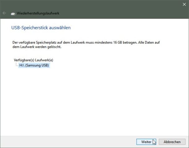 Für ein Win-10-Wiederherstellungslaufwerk benötigt Ihr natürlich als erstes einen passenden USB-Stick. Dieser sollte laut Windows mindestens 16 Gigabyte fassen, damit alle wichtigen Daten darauf passen. Vielleicht lag es an mir, aber in meinen Tests mit einem funktionierenden 16er-Stick hat der Vorgang nicht funktioniert. Greift also besser gleich zu einem USB-Stick mit 32 Gigabyte - viel teurer sind diese zum Glück nicht mehr. Beachtet, dass der Stick bei der Erstellung des Rettungs-Mediums komplett gelöscht wird. Sichert also vorher eventuell vorhandene Dateien vom Stick an andere Stelle.