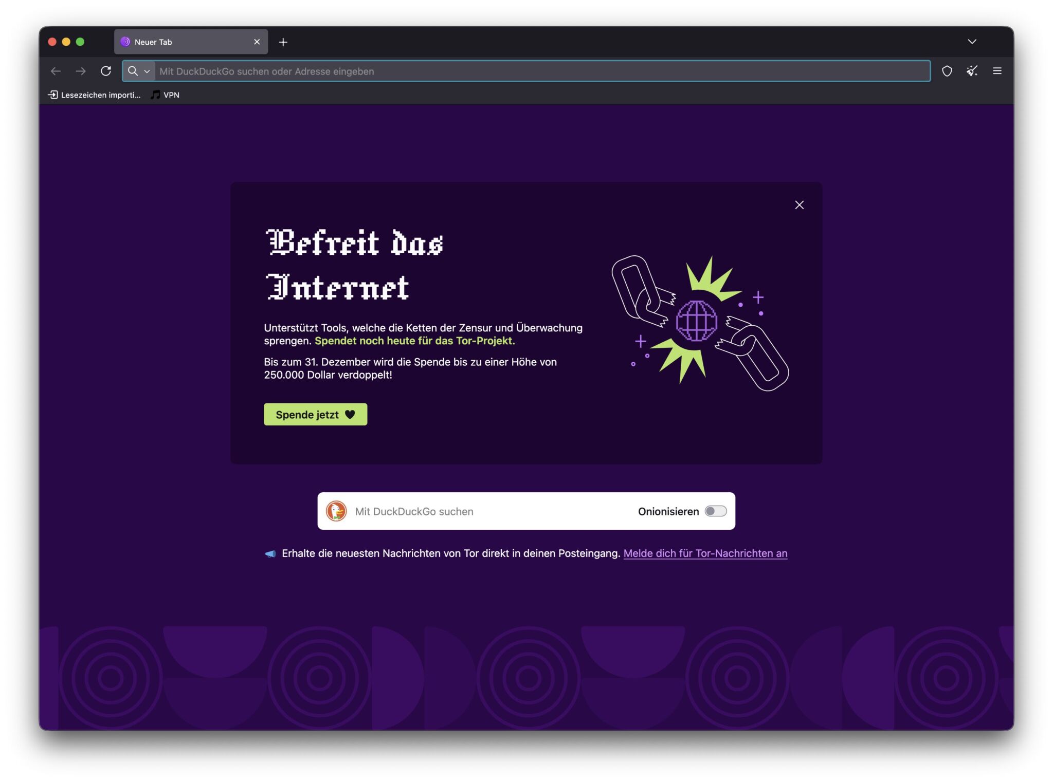 1. Ach so… ja, klar: Wenn Du eine Darknet-URL mit der Endung .onion hast, kannst Du die natürlich auch direkt in die URL-Zeile des Browsers (wo Du sonst „suchst“ eingeben. Ggf. https:// davor schreiben, damit der Browser kapiert, dass Du nicht suchst.