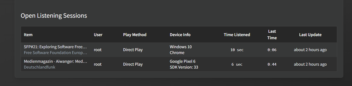 Ein tolles Feature findet Ihr unter Settings/Listening Sessions: Hier werden alle abgeschlossenen und laufenden Sitzungen protokolliert - zumindest für Poweruser sicherlich nützlich.