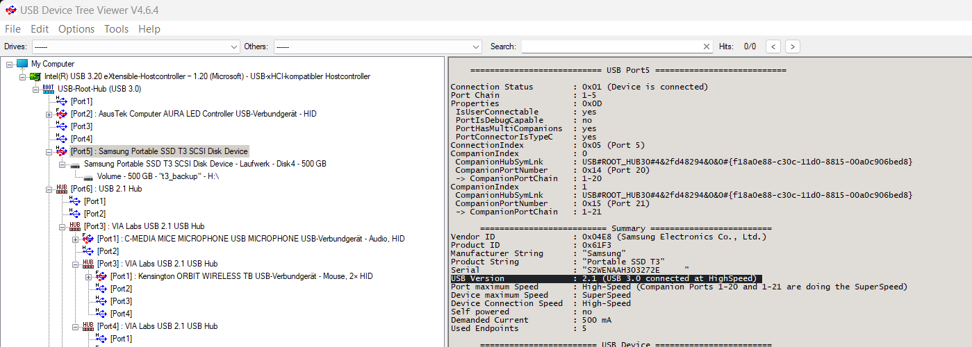 Öhm, 40 MB/s? USB 3.0 bietet theoretisch bis zu 640 MB/s - das ist mir jetzt doch ein weeeeenig zu wenig. Also warum? Bei 40 MB/s dürfte es bei erfahrenen USB'lern klingeln: Ein typischer USB-2-Wert. Naheliegend wäre der Verdacht Platte, aber die Samsung T3 ist eine USB-3-Hardware.