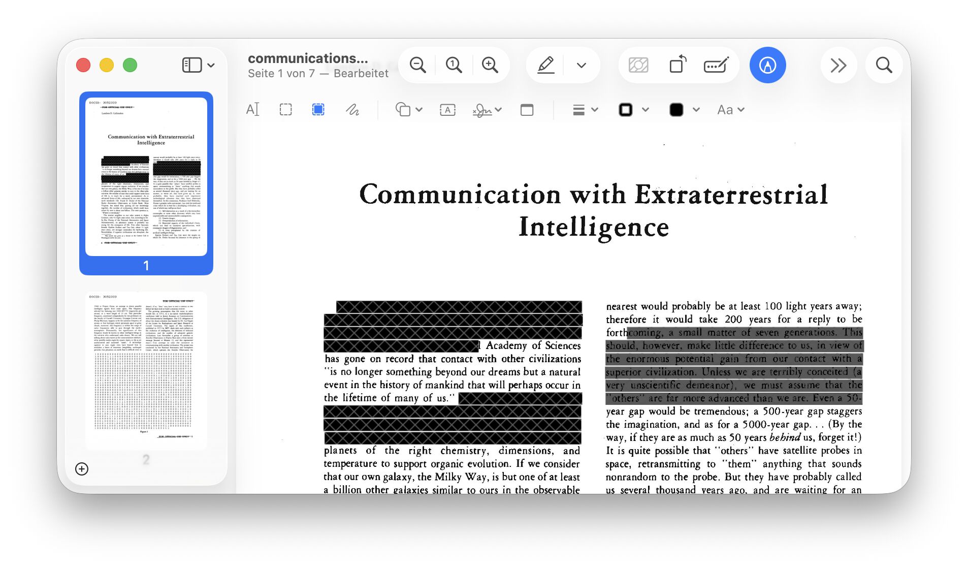 Jetzt habt Ihr in Vorschau ein Markierung- und Textauswahl-Werkzeug, das Euch erlaubt, Bereiche im PDF zu schwärzen: Zieht einen Rahmen auf, um etwa ein Bild zu entfernen. Oder markiert die Textzeilen, um den Text aus dem PDF zu entfernen.