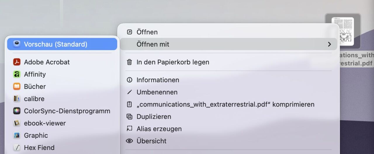 Dann kann es auch schon losgehen: Öffnet zunächst die PDF-Datei mit "Vorschau". Auf den meisten Macs dürfte das per Doppelklick funktionieren. Falls Ihr noch einen anderen PDF-Reader nutzt, kann es aber sein, dass die sie die PDF-Erweiterung geschnappt hat, dann hilft ein Rechtsklick und "Öffnen mit -> Vorschau".
