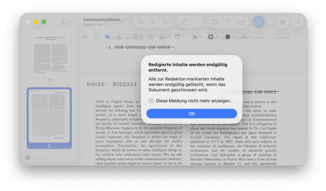 Klickt oben in der Menüzeile auf "Werkzeuge" und dann auf "Redigieren". Nun reagiert Vorschau in einer Warnung: "Alle zur Redaktion markierten Inhalte werden endgültig gelöscht, wenn das Dokument geschlossen wird." Ihr könnt hier einen Haken setzen, dass die Meldung nicht mehr angezeigt wird, ich würde aber empfehlen, sie so zu lassen. Klickt jetzt auf "OK".