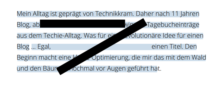 Fehler 1: Gar nicht geschwärzt. Das ist immerhin zwei mal so vorgekommen: Es wurde ein schwarzes Rechteck über den Text gelegt - man konnte ihn nicht mehr sehen. Aber markieren und kopieren ging sehr wohl. Das ist natürlich absurd schlecht.