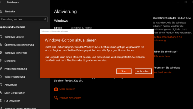 - Tragt nun Euren Windows-10-Pro-Key ein und klickt auf Weiter. Der Schlüssel wird nun geprüft. Ist er gültig, meldet Windows 10, dass Ihr die Edition aktualisieren dürft. Klickt auf Start, um dies zu tun. Am Ende des Vorgangs startet Euer PC allerdings neu.